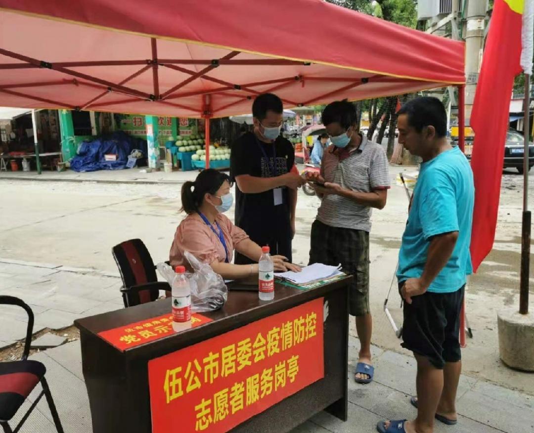 在伍市集镇内,有这样一群身影,凭着一把遮阳伞、一顶小红帽、一件红马甲,当人们还在因为炎热躲在空调房内不敢出门的时候,他们早已值守在集镇各处党员示范岗。他们就是伍市镇居委会新时代文明实践所志愿服务分队。他们在伍市镇农贸市场的进出口值守,保障公共场所的卫生安全;在群众家中登记健康码、行程码和疫苗接种情况,确保疫情防控无漏洞;在摸排劝导群众“婚事缓办、白事简办、它事不办”,杜绝多人聚集、聚餐......他们是以彭放求为代表的老党员、以姚俊宇为代表的返乡大学生、以刘波为代表的退役军人,他们是心怀大爱的志愿者,更是伍市最牢靠的“疫情防控墙”。