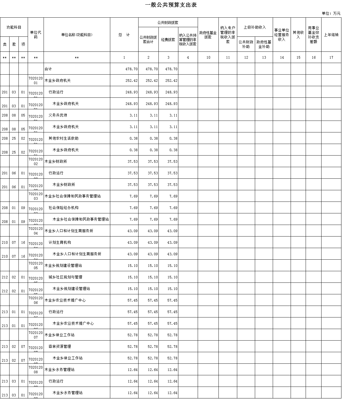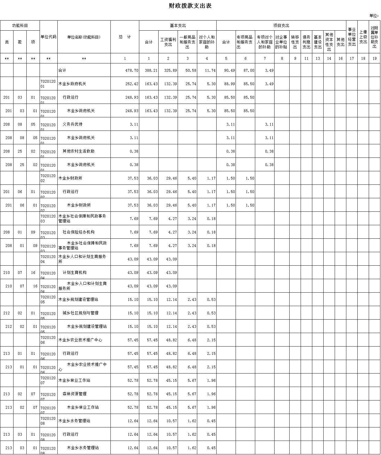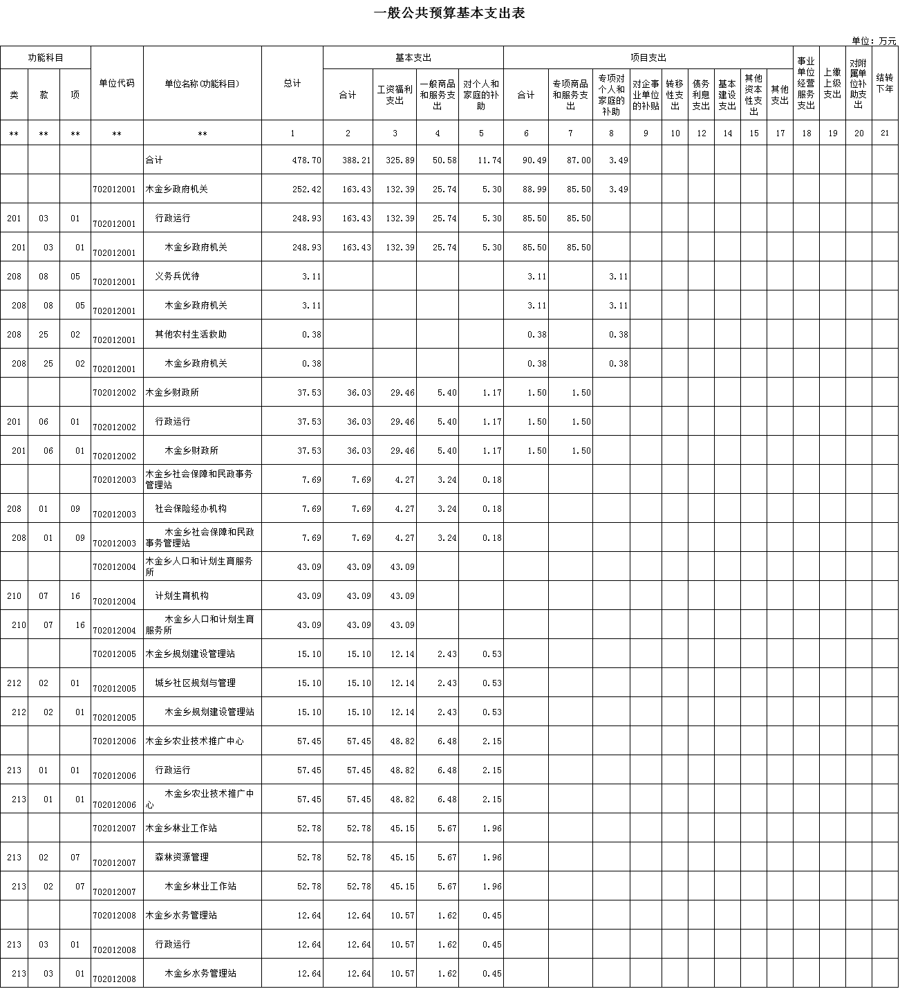 2016年1月,本单位共有人员数为57人。其中:政府机关21人;财政所6人;人口与计划生育服务所9人;社会保障和民政事务办1人;水务管理站2人;规划建设管理站2人;农业技术推广服务中心8人;林业工作站8人;机关退休人员21人。基本工资135.92万元,规划性津补贴119.12万元,年终一次性奖金9.78万元,一般商品和服务支出50.58万元,对个人和家庭补助11.74万元,社会保障缴费61.07万元,合计388.21万元。项目支出90.49万元。