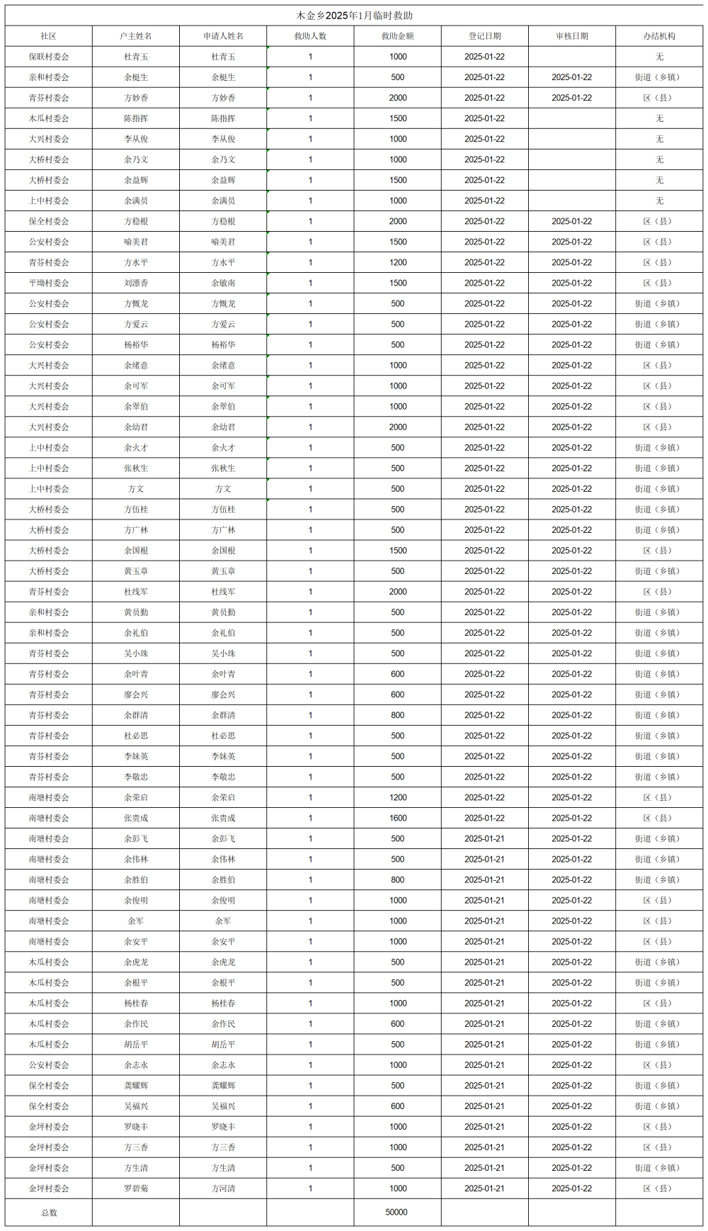 木金乡2025年1月份临时救助