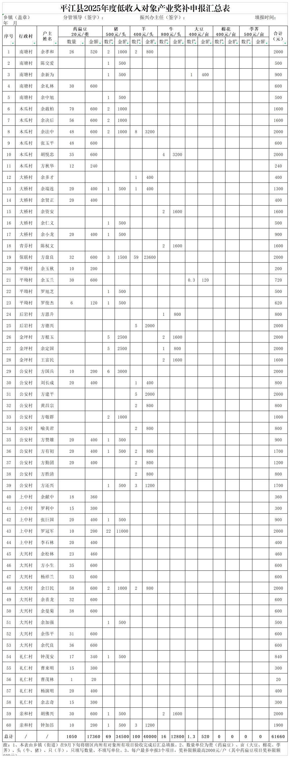 木金乡2025年度第一批低收入对象产业奖补申报汇总表