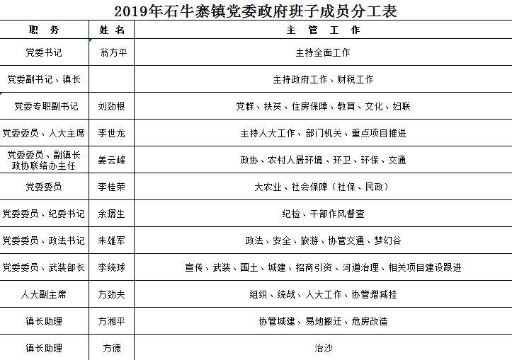 2019年度石牛寨镇领导干部分工明细表