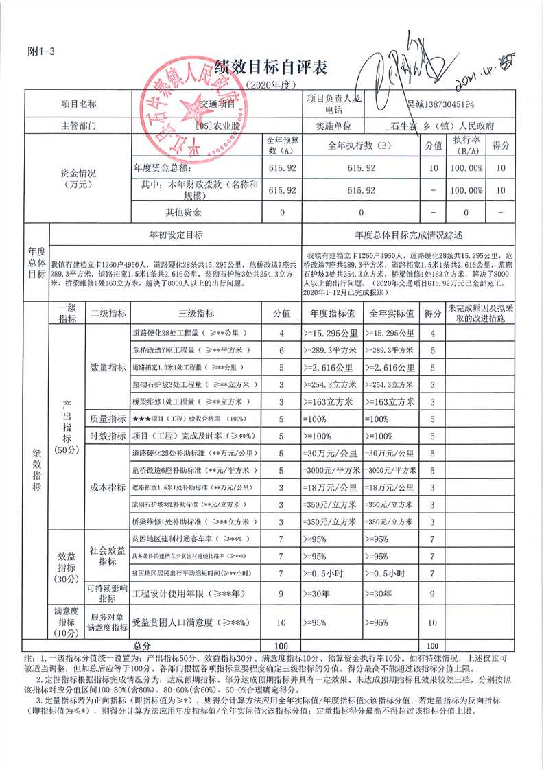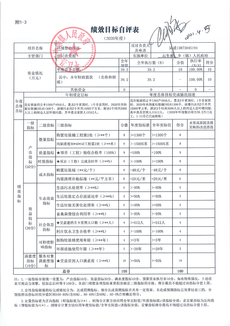 石牛寨镇2020年度统筹整合财政涉农资金绩效自评表