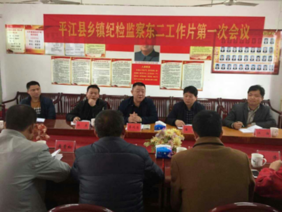3月30日上午,平江县乡镇纪检监察东二工作片在我镇揭牌成立,并在我镇三楼会议室召开第一次会议。县纪委副书记、监察局局长李远志,县纪委常委潘虹及东二工作片全体成员参加揭牌仪式并参加会议。会议由县纪委常委潘虹主持。
