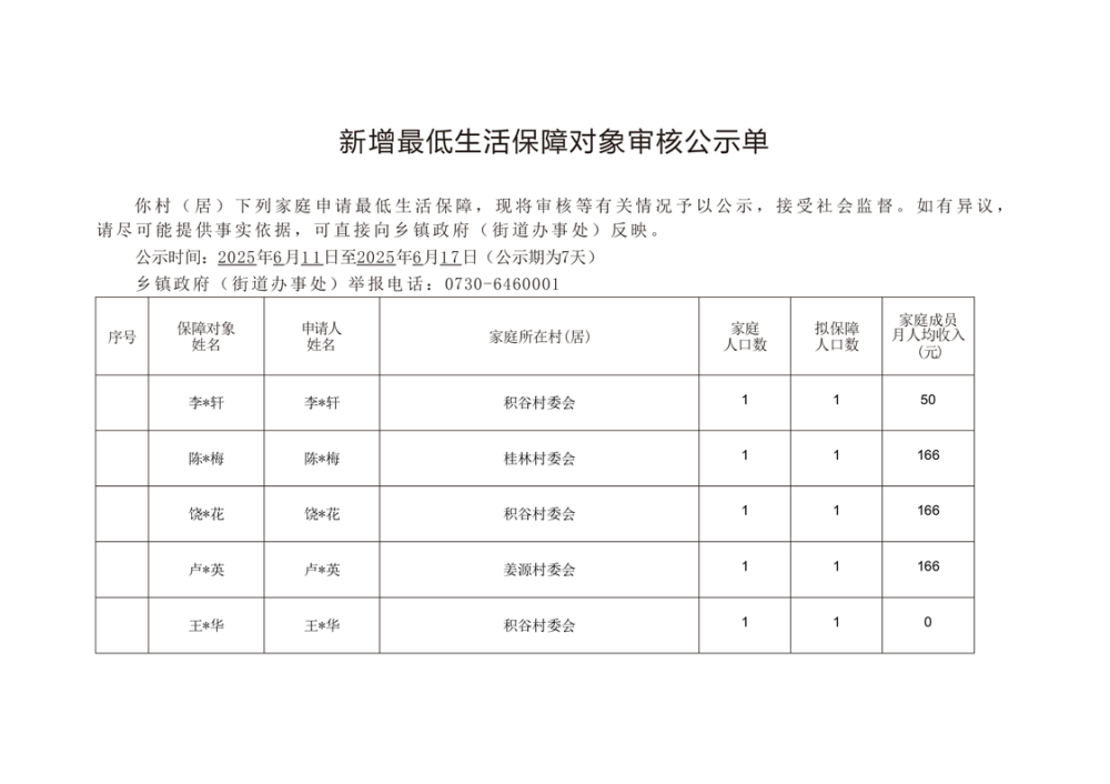 新增最低生活保障对象审核公示单(6.11)