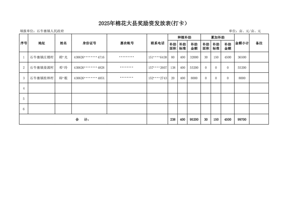 2025棉花大县奖励资金发放表(石牛寨镇)