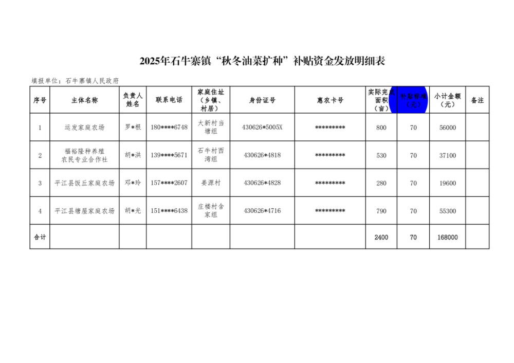 2025石牛寨镇“秋冬油菜扩种”补贴资金发放明细表