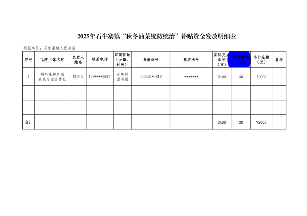 2025石牛寨镇“秋冬油菜统防统治”补贴资金发放明细表