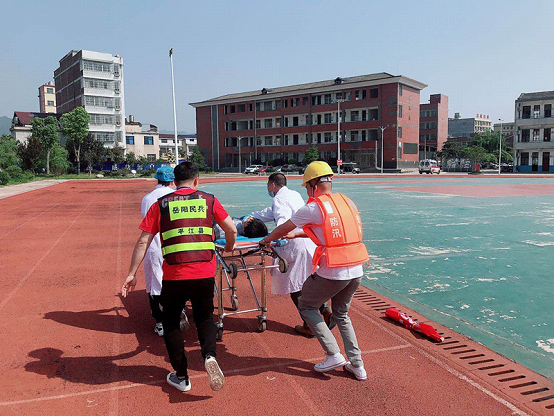 此次演练模拟突发暴雨,每小时降雨量达到100mm以上,水位上升,积水深达1米以上,学生与教师被困教学楼,情况十分危急,万家村张家组黄远芳屋后山坡发生山体崩塌,导致泥石流,严重危及附近居民的生命财产安全,群众举报至防汛值班室后,值班室立刻上报防汛指挥部,镇防汛指挥部立即启动防汛抢险应急预案,组织专门的抢险人员及医疗队伍对现场受伤人员进行紧急救援,将被困教师、学生、群众安全转移至临时避难点,至此演练结束。