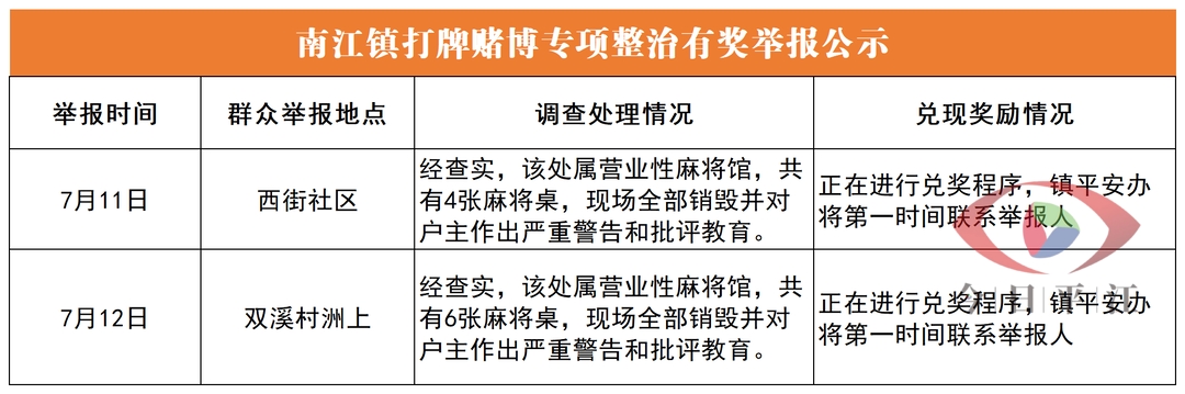 欢迎广大群众拨打0730—6561319(南江派出所报警电话)、0730—6561313(南江镇党政办值班电话)进行打牌赌博有奖举报,凡举报经核查属实的,奖励第一举报人500元每次。我镇将对举报人身份进行保密,对打击报复举报人、证人的,将依法从严从重处理。