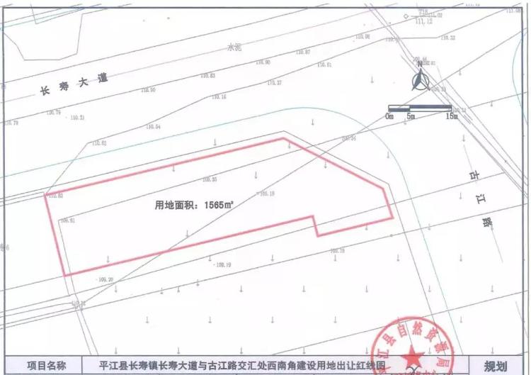 该宗出让的国有建设用地位于长寿镇长寿大道与古江洲路交汇西南角,总用地面积1565平方米。(详见规划用地红线图)。