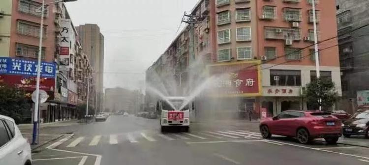 环境整治办每天组织大型洒水车利用84消毒液对集镇街道进行消毒作业。