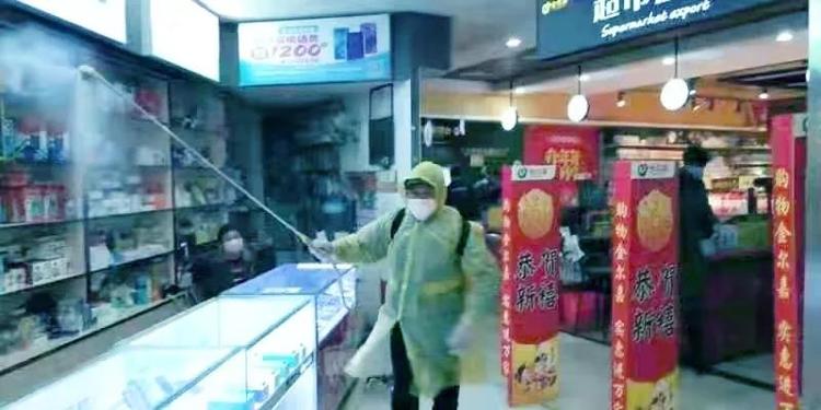 环卫工人每天对农贸市场、超市、隔断点等公共区域进行消毒作业,广大党员干部和志愿者们对进入公共场所的群众进行体温监测和信息登记。