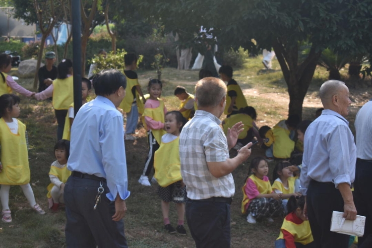 广场上,恰巧有一个幼儿园在举办户外活动。在老干部们经过的时候,小朋友们开心雀跃的打招呼,你一句我一句的叫着“爷爷奶奶”。这一场过去与未来的碰面,满是敬意与期待。