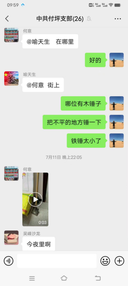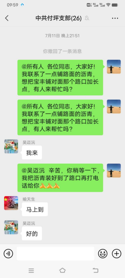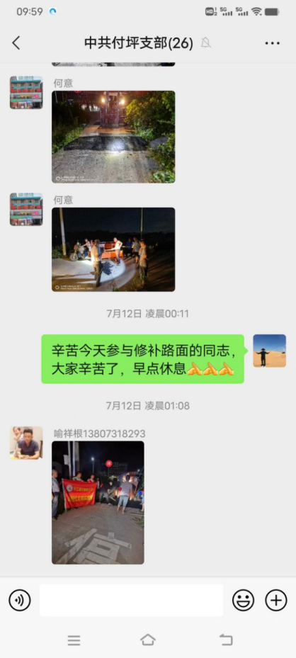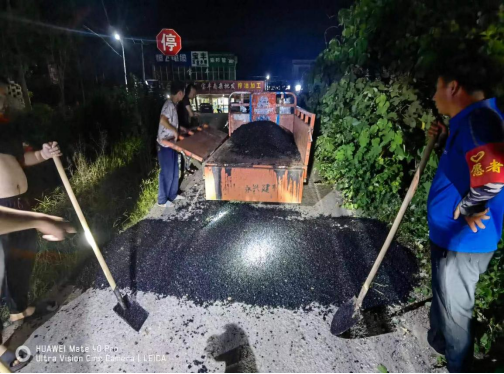 他立马联系了两辆三轮车,同时在付坪村支部微信群中发出召集志愿者的消息,消息一经发出,立刻得到响应。十五分钟后,近十名党员志愿者都带上工具驱车来到长寿大道装沥青。尽管天气炎热,当时已是晚上十点,近十名党员志愿者你一铲,我一铲,很快将沥青装好了车并运至将付坪学校,将沙田、沙龙境内道路的六个裂缝修补好。活动结束已经是晚上十二点。破损的路面修复后,群众的出行安全也得到了保障,大家赞不绝口。