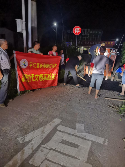 “大家再一起加把劲,我们争取今晚就能结束这个大工程”,夏日的夜晚依旧炎热,长寿镇付坪村的支村两委与党员志愿者却不惧高温与蚊虫的干扰,大家正齐心协力修补路面。
