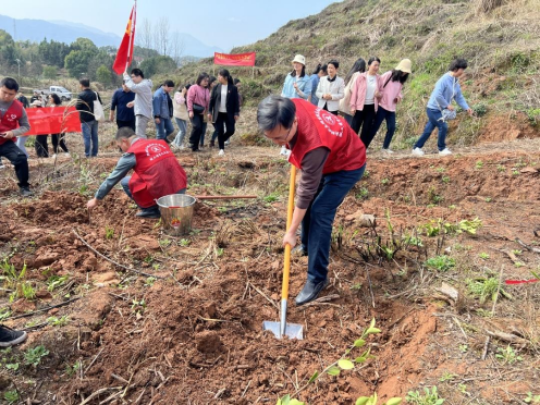 活动现场,在党委书记谭晓峰的带领下,志愿者们主动分为两人一组,大家分工协作,挥锹铲土、提桶浇水、扶树正苗……有条不紊地种下一棵棵优质茶树苗,让久荒的山丘焕发新的生机。