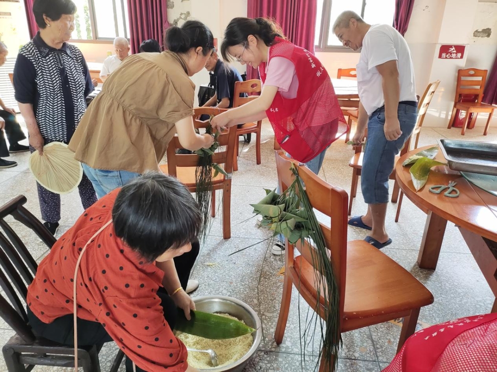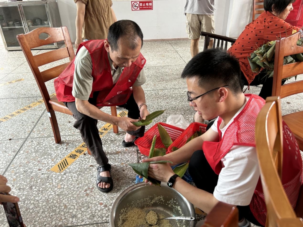活动当天,党员志愿者们一早便来到了长寿敬老院布置现场,大家齐心协力拉横幅、摆桌椅、备材料,有条不紊地为活动做准备。活动开始,在老党员冯阿姨的帮助下,党员志愿者与敬老院的老人们一起,开始了奇妙的“包粽子”之旅。“哎,这个米怎么散了?”“粽叶怎么折呀,我还是没学会。”“谁教教我怎么绑牢固?”……“砰”一个志愿者正在绑的粽子突然掉到了地上,撒了一地,请教声戛然而止,志愿者和老人们笑成一团。 ( 刘顺、伍晴晖 )