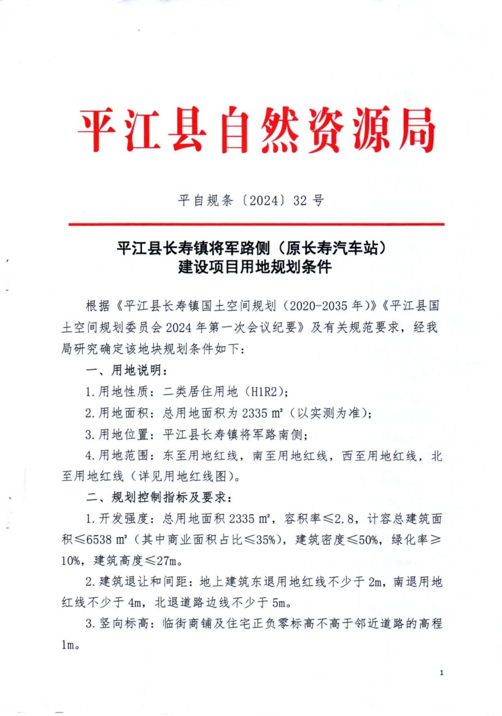 经平江县人民政府批准,平江县自然资源局决定以挂牌出让方式出让长寿镇1(幅)地块的国有土地使用权。现将有关事项公告如下: