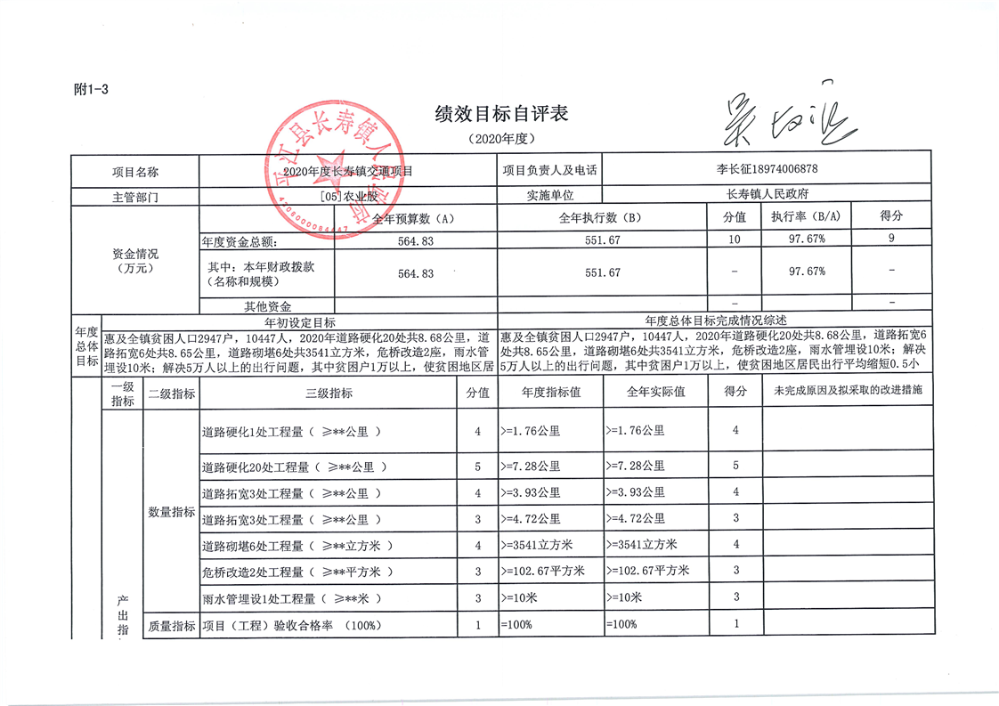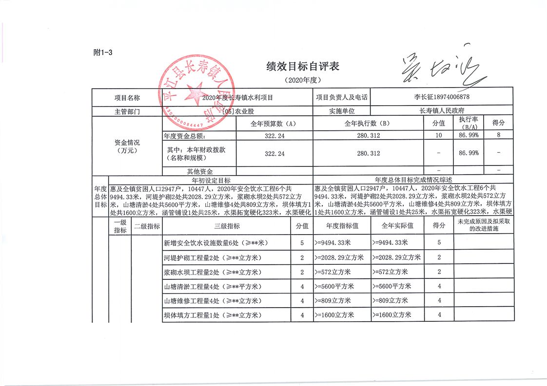 长寿镇2020年度统筹整合涉农资金项目库预算绩效目标自评