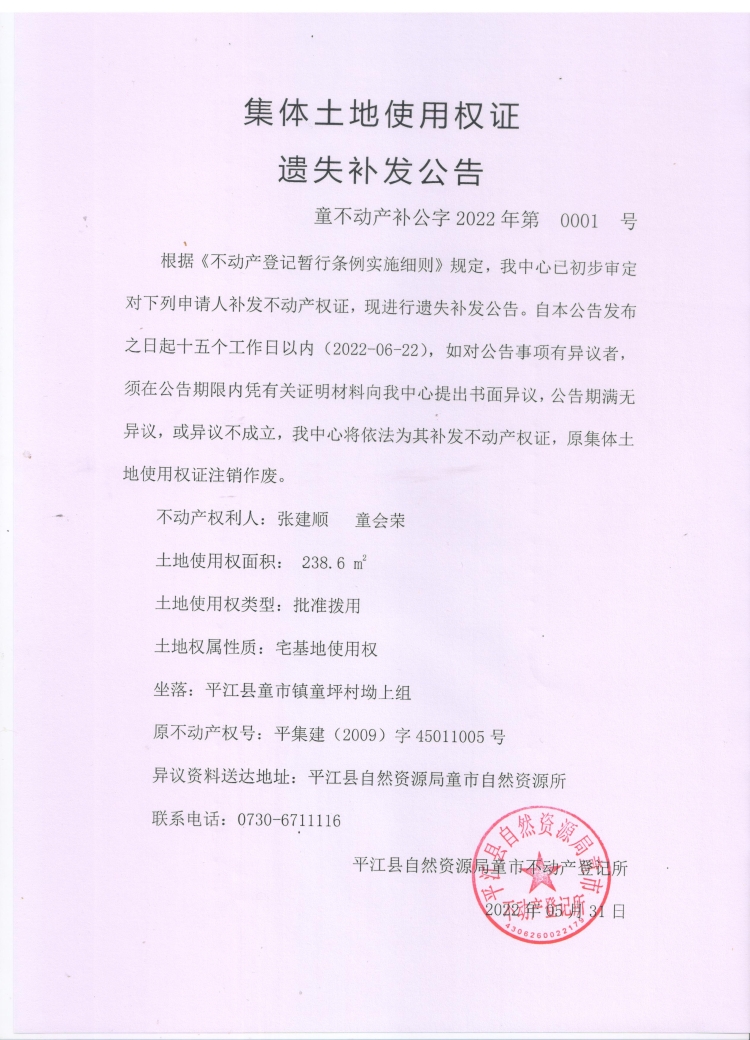 童市镇张建顺、童会荣集体土地使用权证遗失补发公告