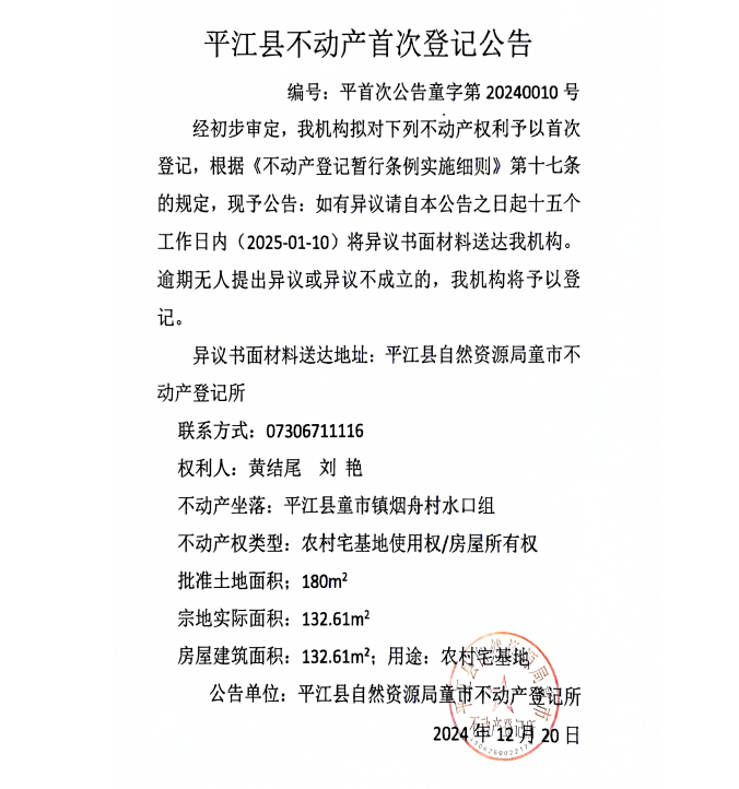 平江县不动产首次登记公告(黄结尾,刘艳)