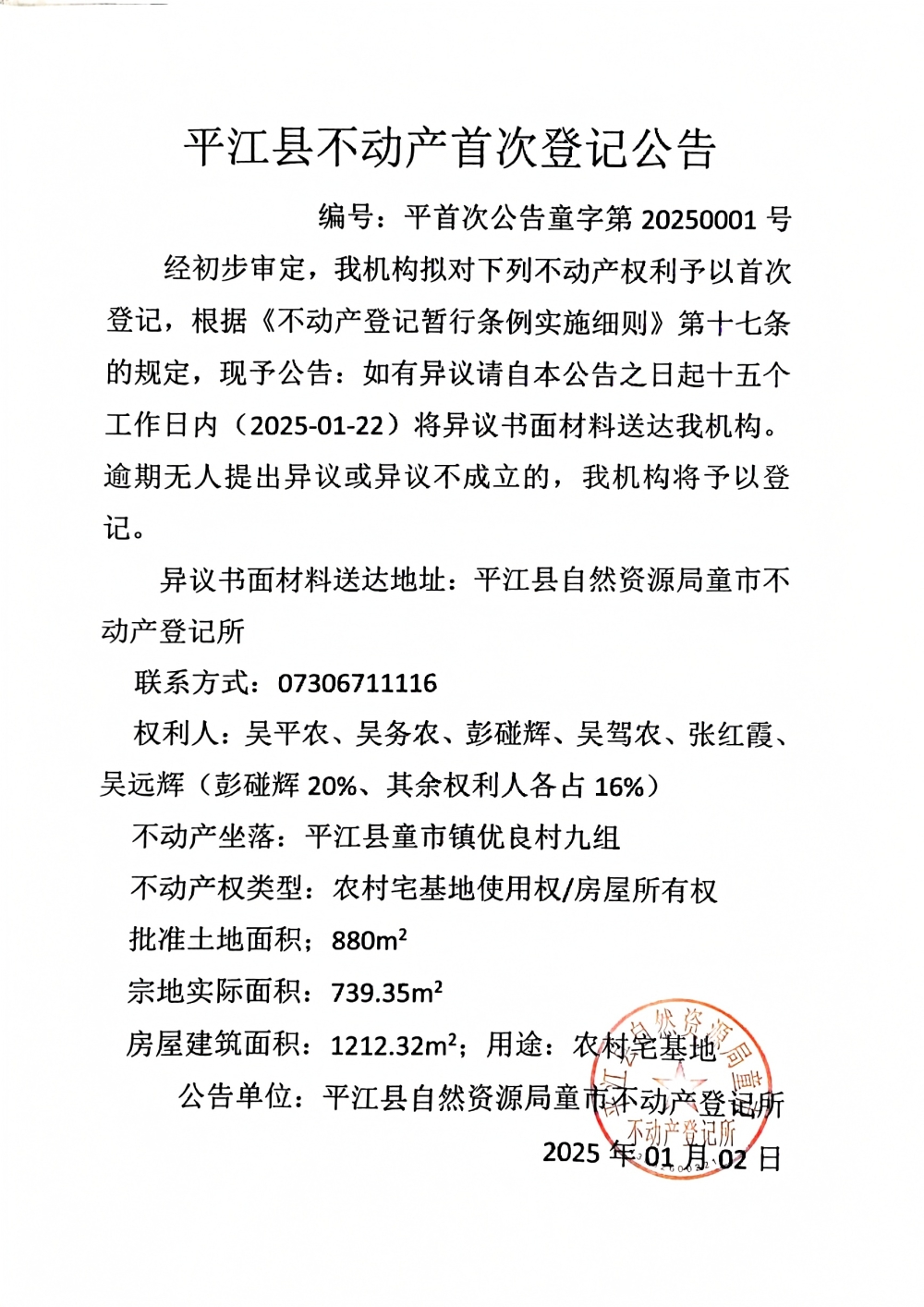 平江县不动产等次首次公告(吴平农等6人)