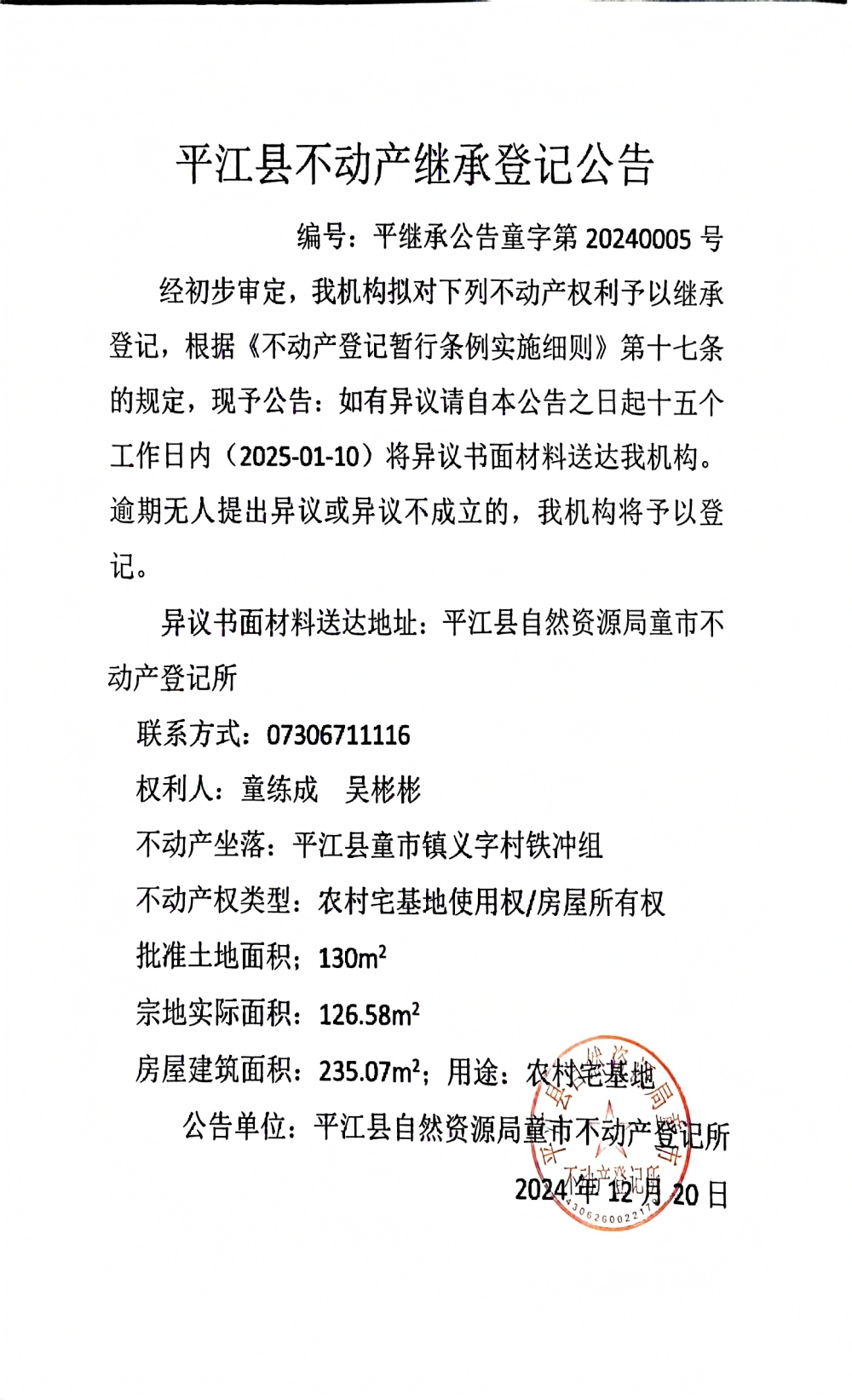 平江县不动产继承登记公告(童练成 吴彬彬)