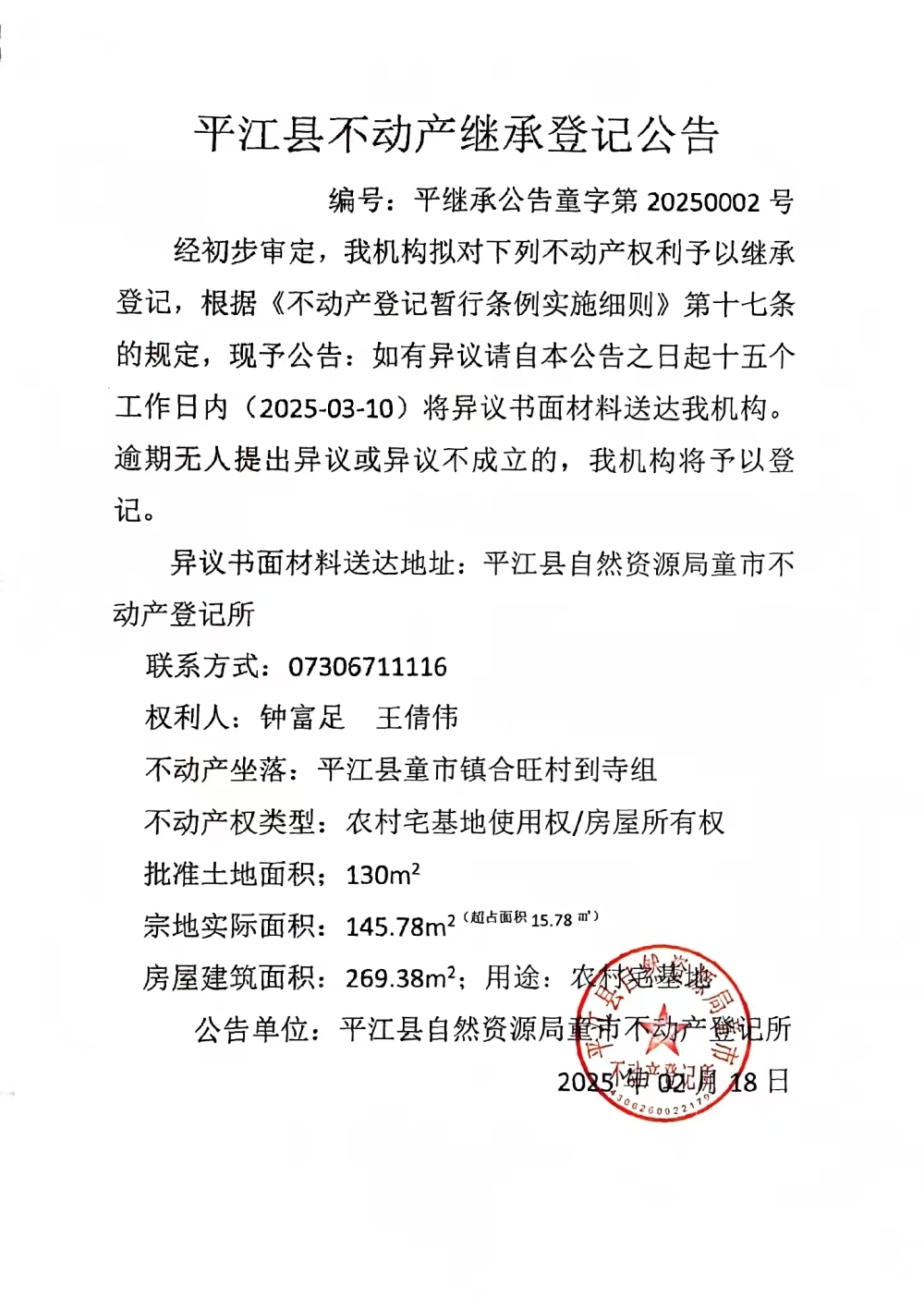 平江县不动产继承登记公告(钟富足 王倩伟)