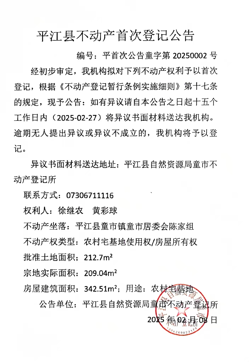 平江县不动产继承登记公告 (徐继农 黄彩球)