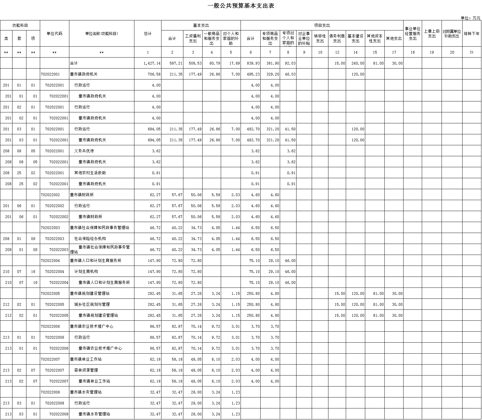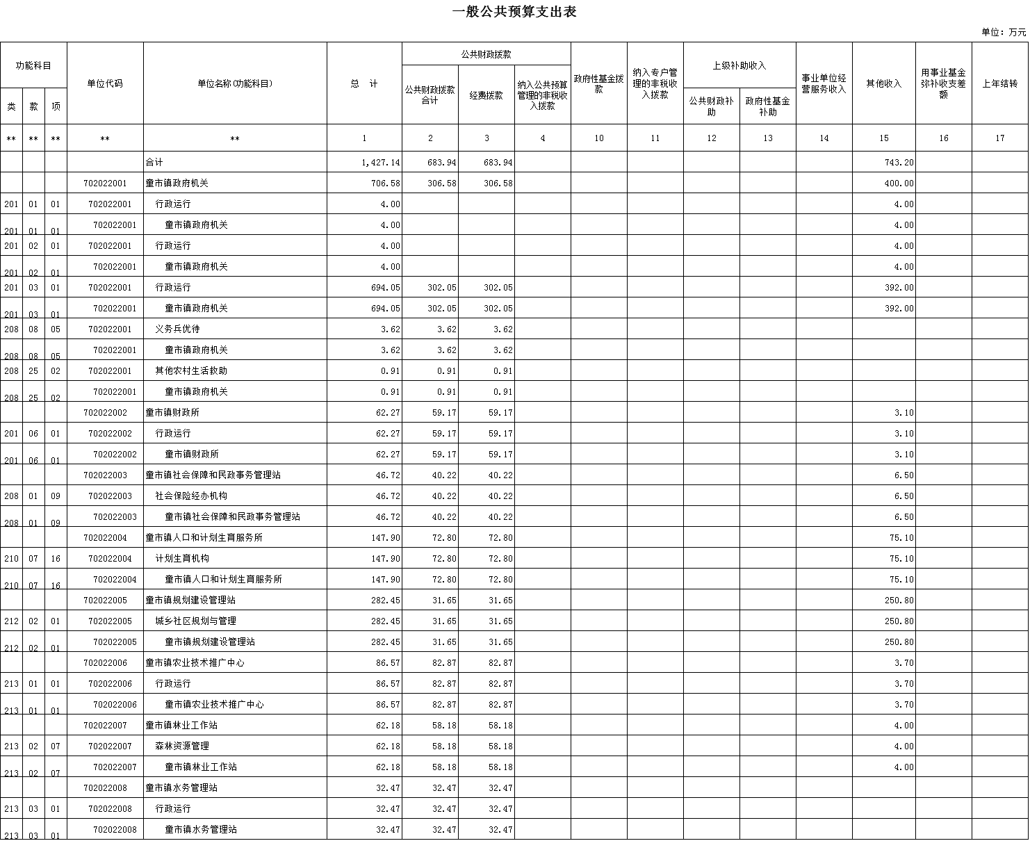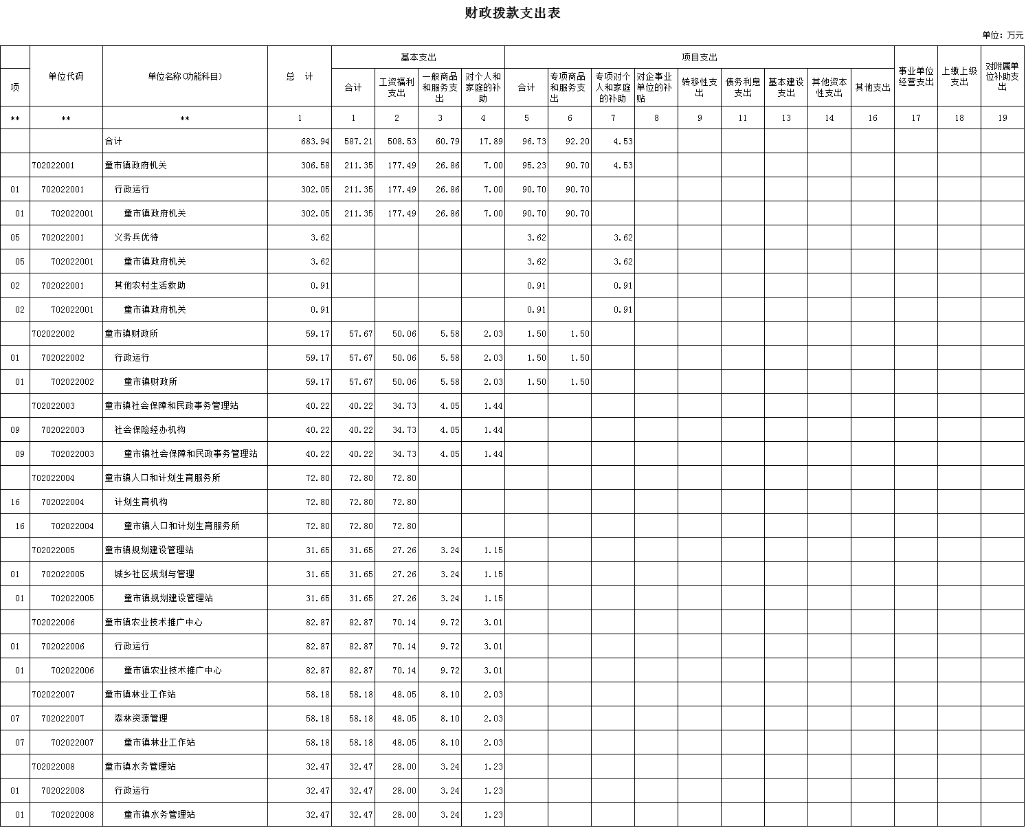 童市镇所辖26个村, 1个居委会,农业人口30000人,镇财政现有预算拨款人数109人。其中行政27人、财政9人、民政7人、计育服务所人员15人、建管5人、农技12人、林业9人、水管5人、退休人员20人(基本退休费由劳动社会保障局负担,本单位负担退休生活补贴)。