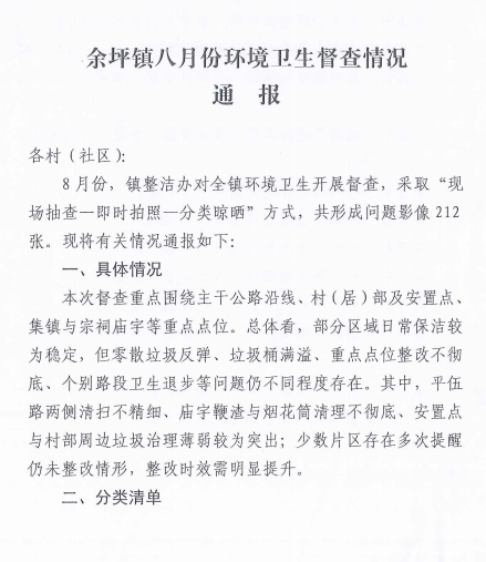 余坪镇八月份环境卫生督查情况通报