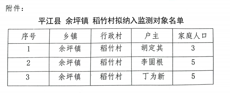 平江县余坪镇稻竹村拟纳入监测对象名单公示