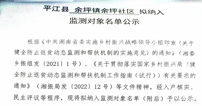 平江县余坪镇余坪社区拟纳入监测对象名单公示(第三批)