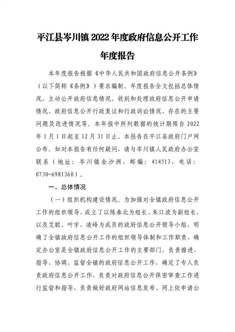平江县岑川镇人民政府2022年度政府信息公开工作年度报告
