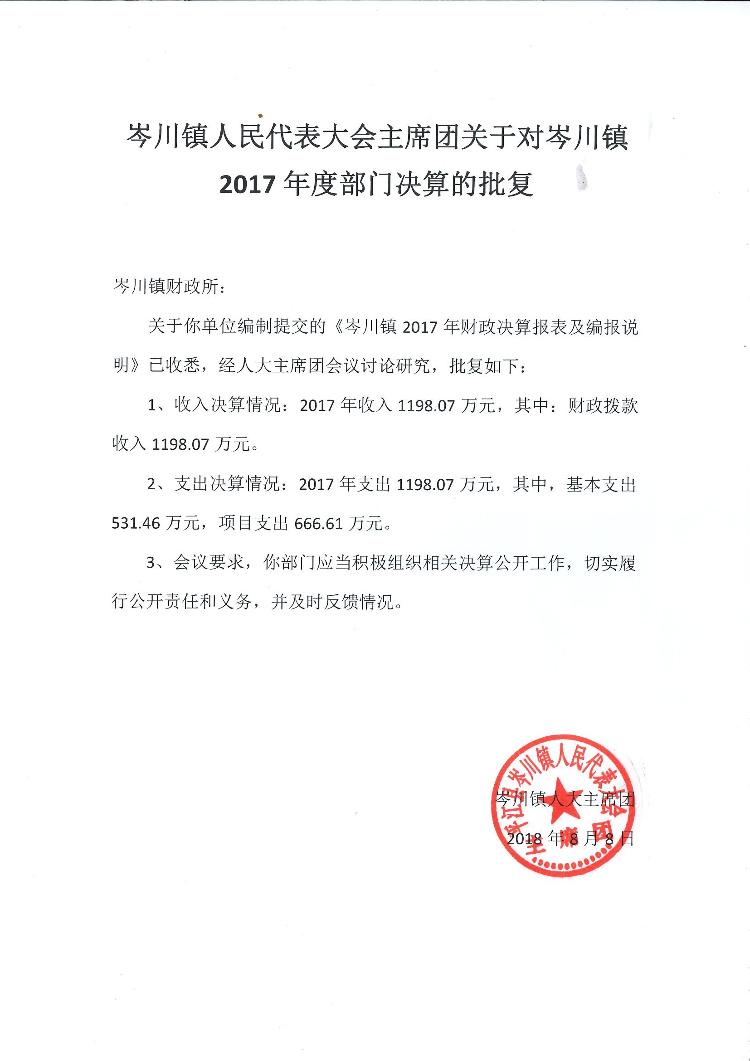 关于通过岑川镇2017年度部门决算批复的通知