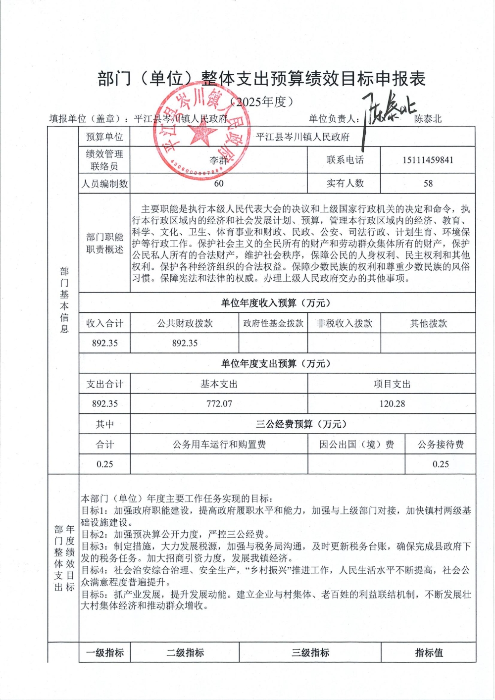平江县岑川镇2025年部门预算编报说明及整体绩效目标公开