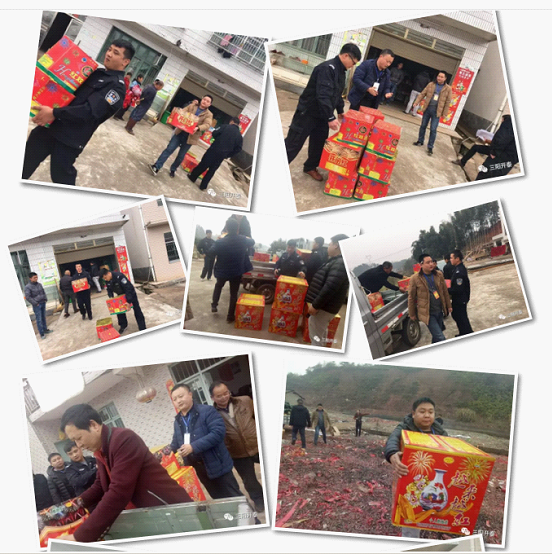 今日共出动32名工作人员,对全乡所有超市、小卖部、杂货店、零售网点进行盘查清缴,共清查57家网点,下达清缴文书34份,清缴烟花鞭炮2382件,并在天岳公墓山将所有收缴的烟花爆竹进行集中销毁。