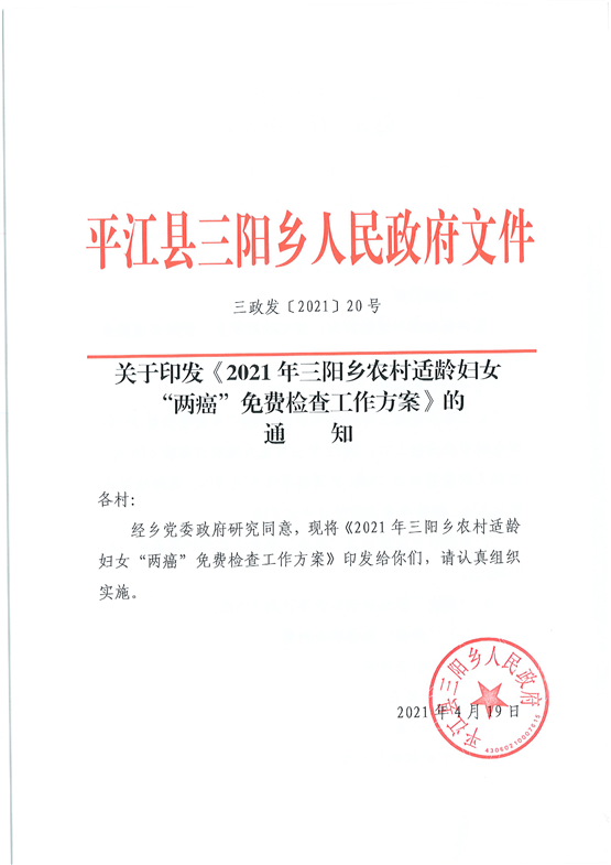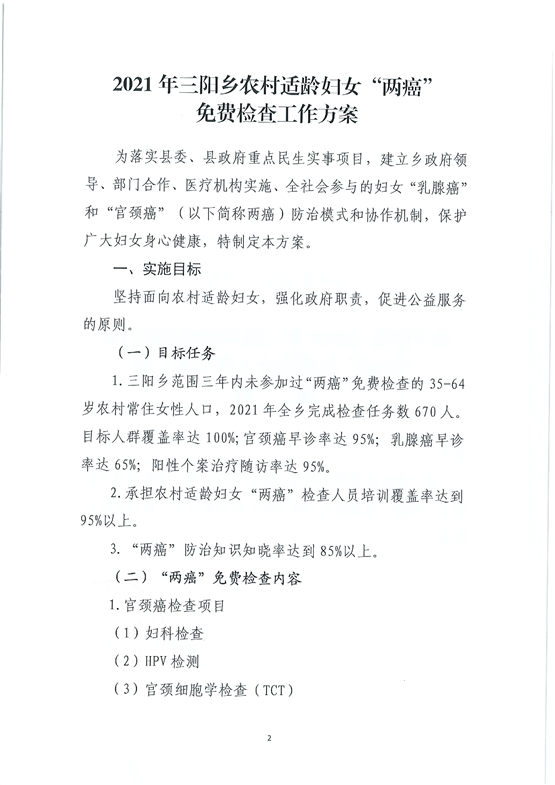 2021年三阳乡农村适龄妇女“两癌”免费检查工作实施方案