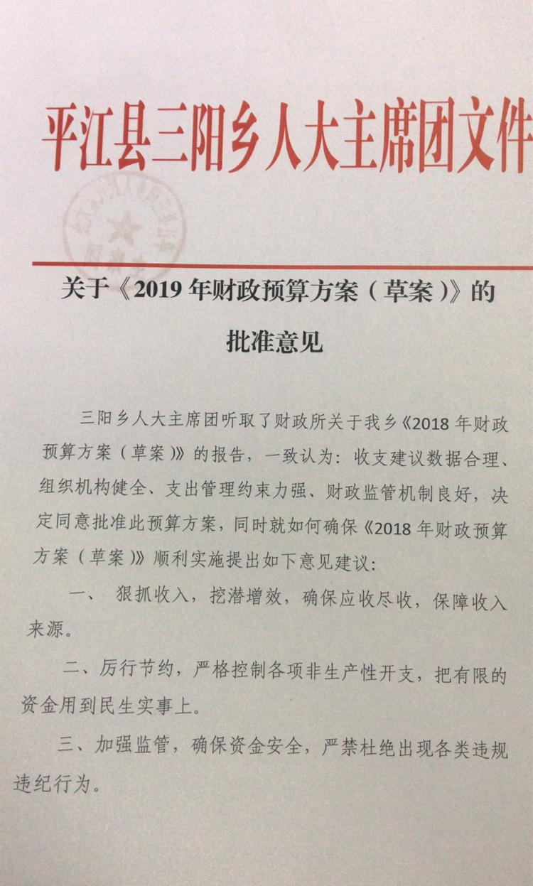 三阳乡关于《2019年财政预算方案(草案)》的批准意见
