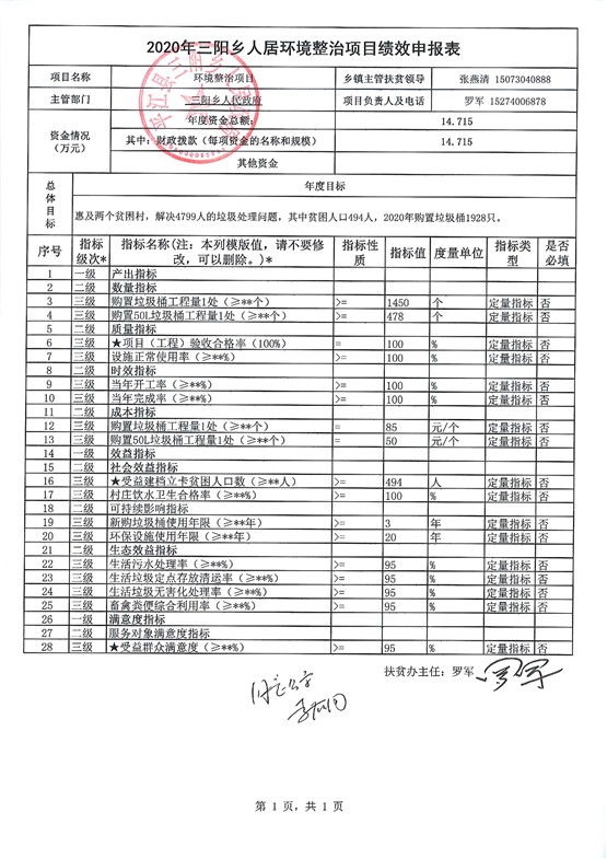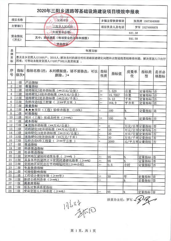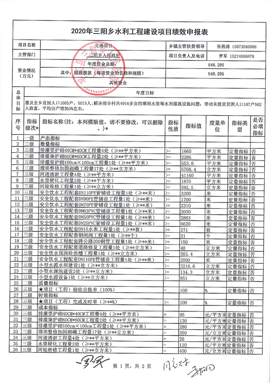三阳乡2020年统筹整合涉农资金项目库预算绩效申报表(调整)