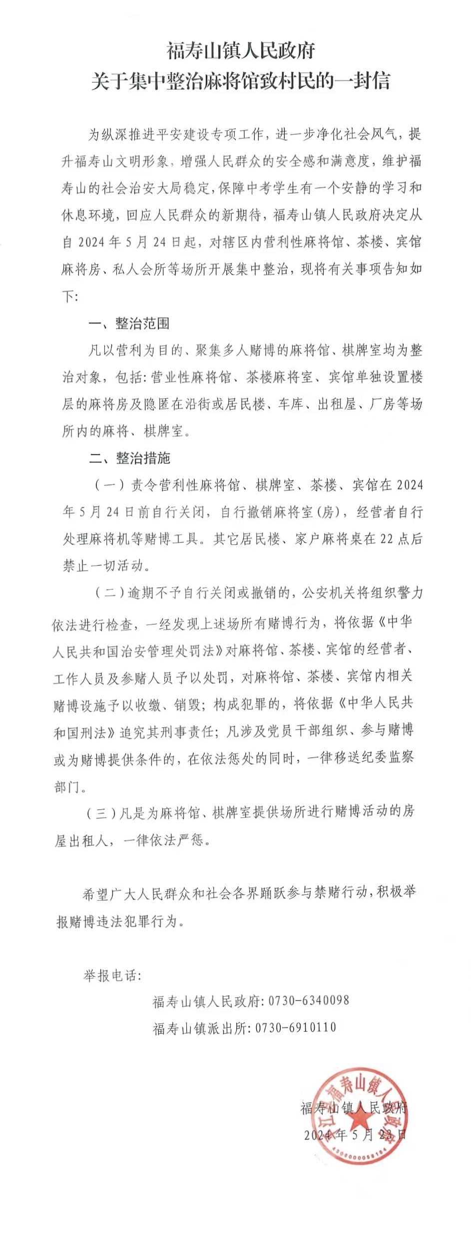 福寿山镇人民政府关于集中整治麻将馆致村民的一封信