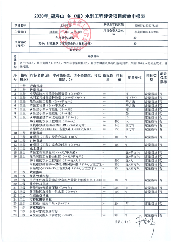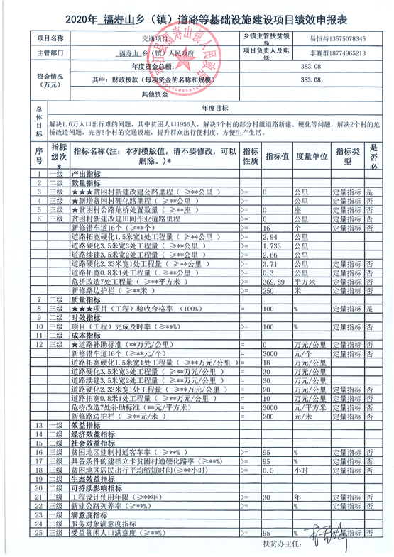 福寿山镇2020年道路等基础设施建设项目库绩效申报表(调整)