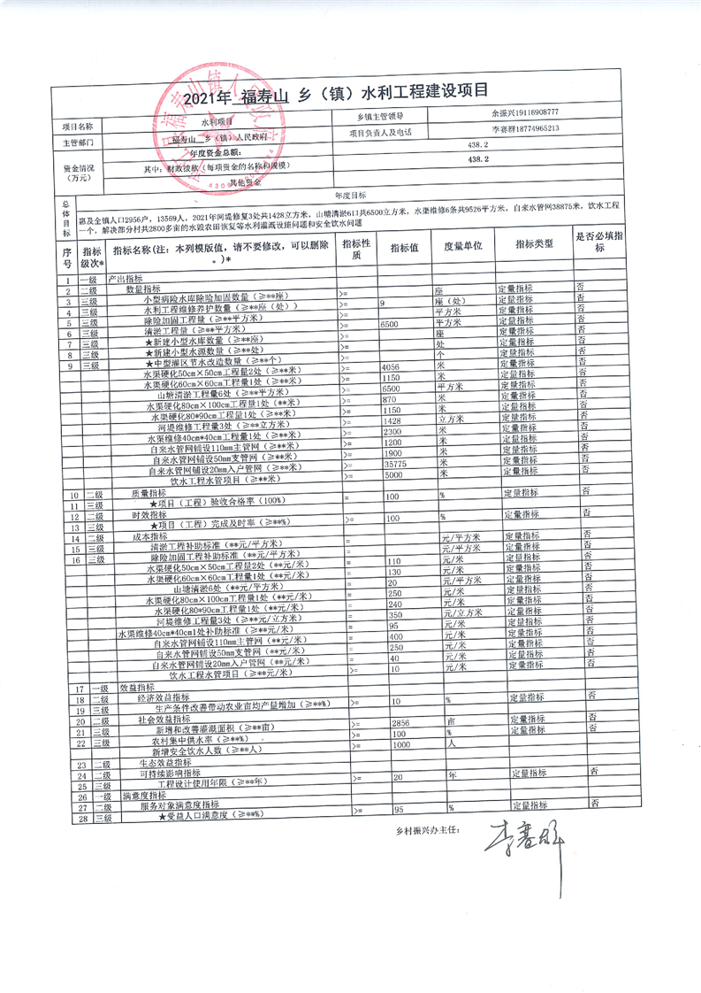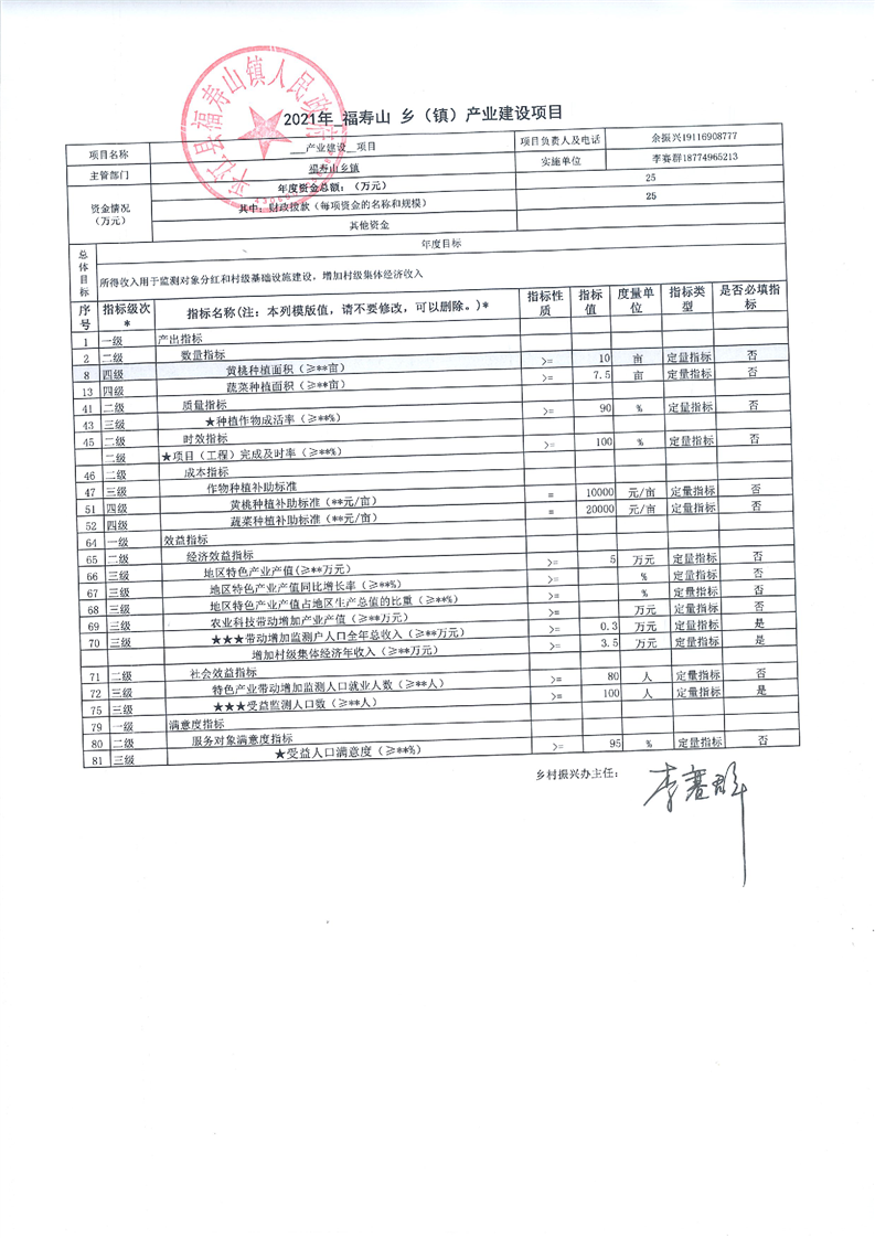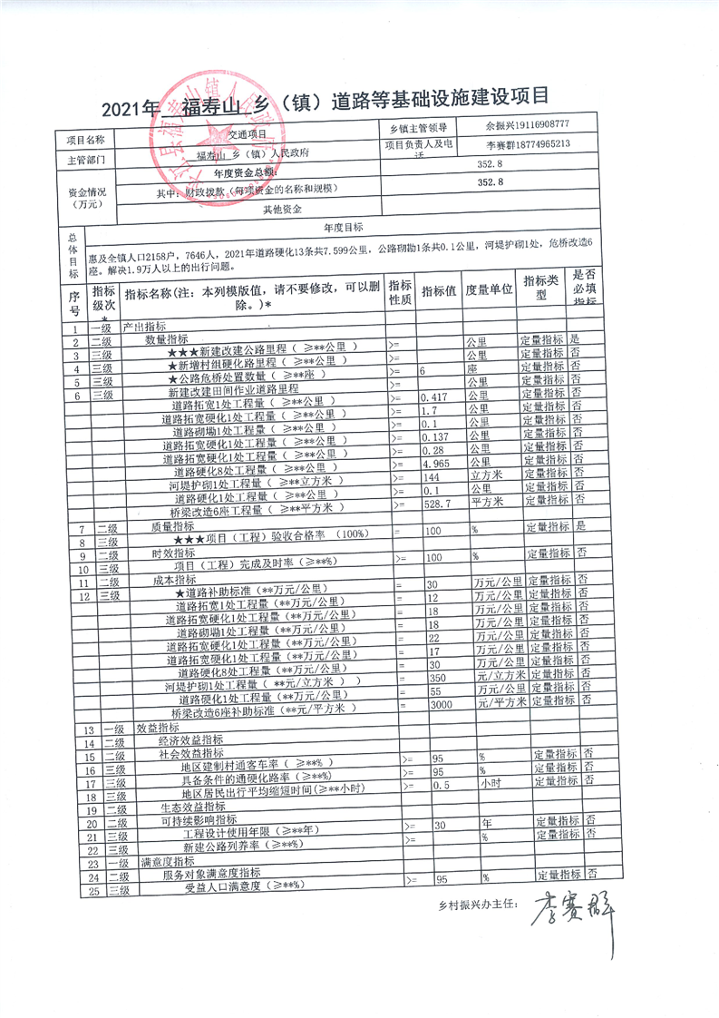 福寿山镇2021年度统筹整合财政涉农资金项目库绩效申报表