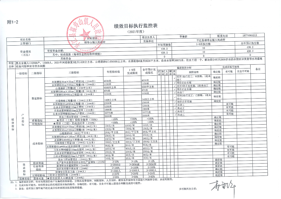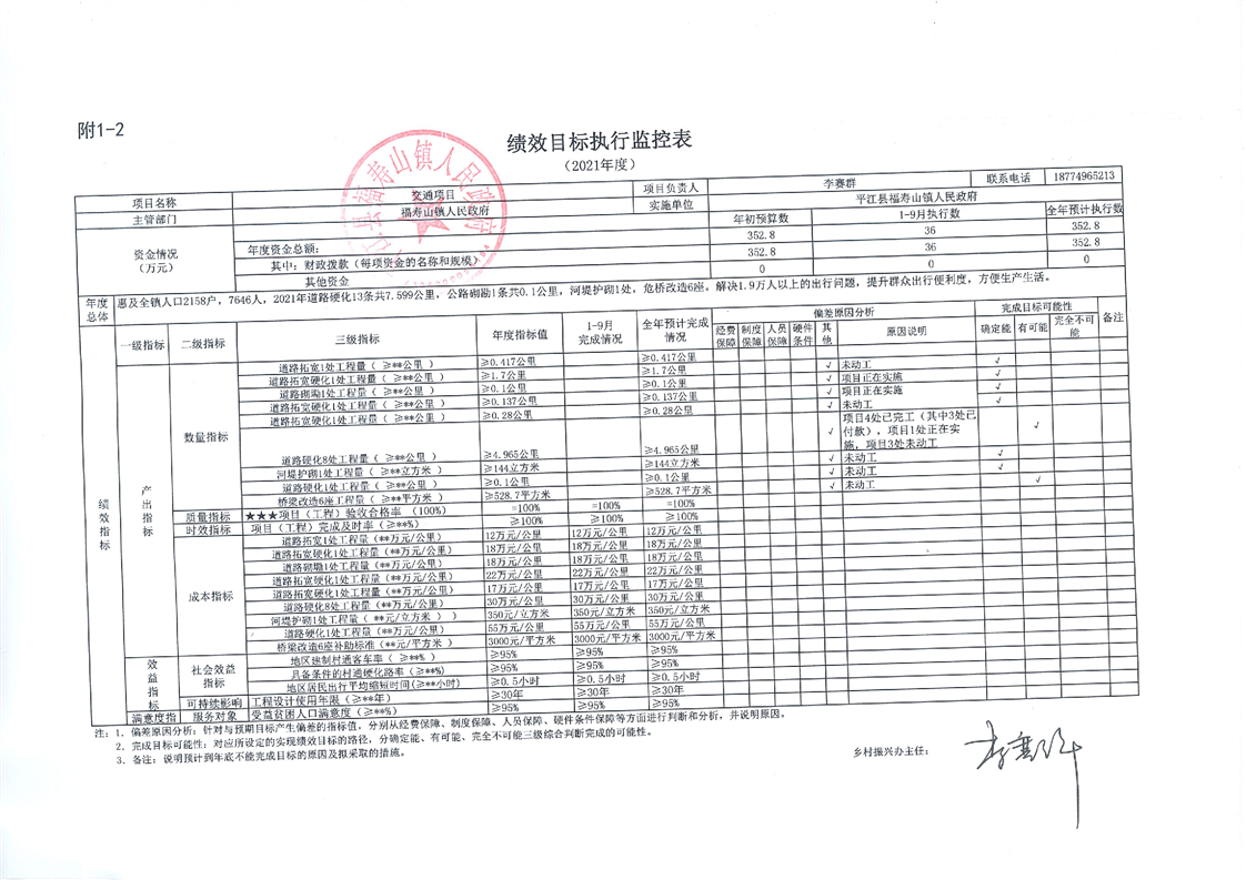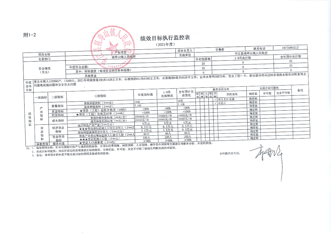 福寿山镇2021年度统筹整合财政涉农资金项目库绩效目标执行监控表