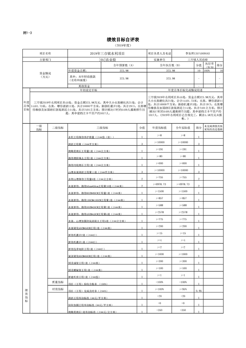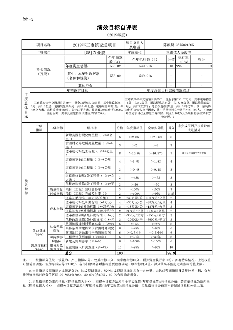 三市镇2019年财政扶贫资金绩效目标自评申报表