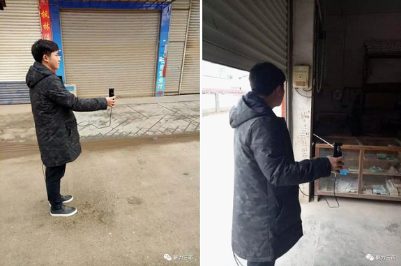 镇行动小组成员手持烟花爆竹探测仪对街道两旁的民居店铺进行探测,在路过一家关上卷闸门的居民房屋时,探测仪上面的探测线突然指向该房屋固定不动,见此情况,行动小组立即找到房主,要求其打开楼房第一层的卷闸门,接受镇行动小组的检查。