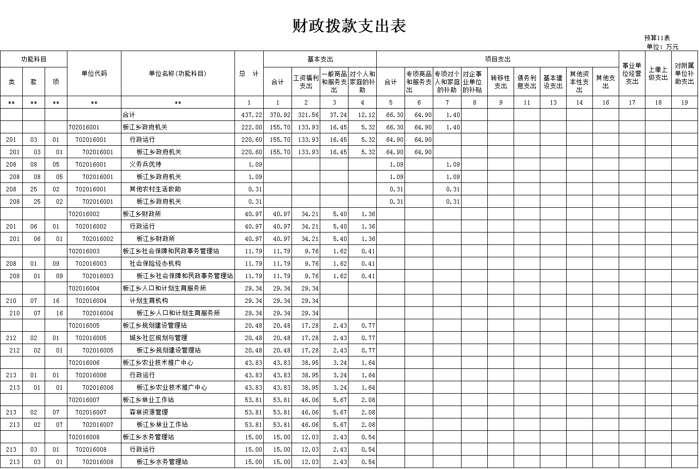 2016年,全乡财政预算拨款数为437.22万元,其中机关预算拨款数222万元,各站所预算拨款215.22万元。