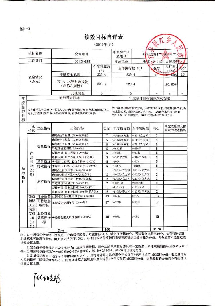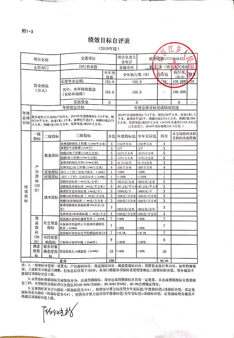 板江乡2019年绩效目标(自评)申报表