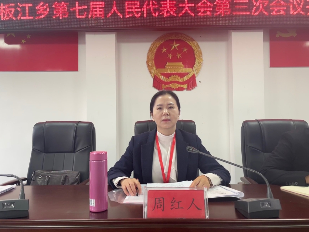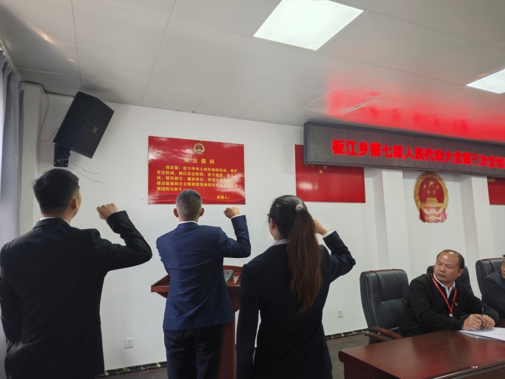 新当选板江乡人大主席邹江、人民政府副乡长周芷荞、人大副主席白洋向宪法进行庄严宣誓。会议还审议通过了乡政府工作报告、人大工作报告和财政预算决算报告。