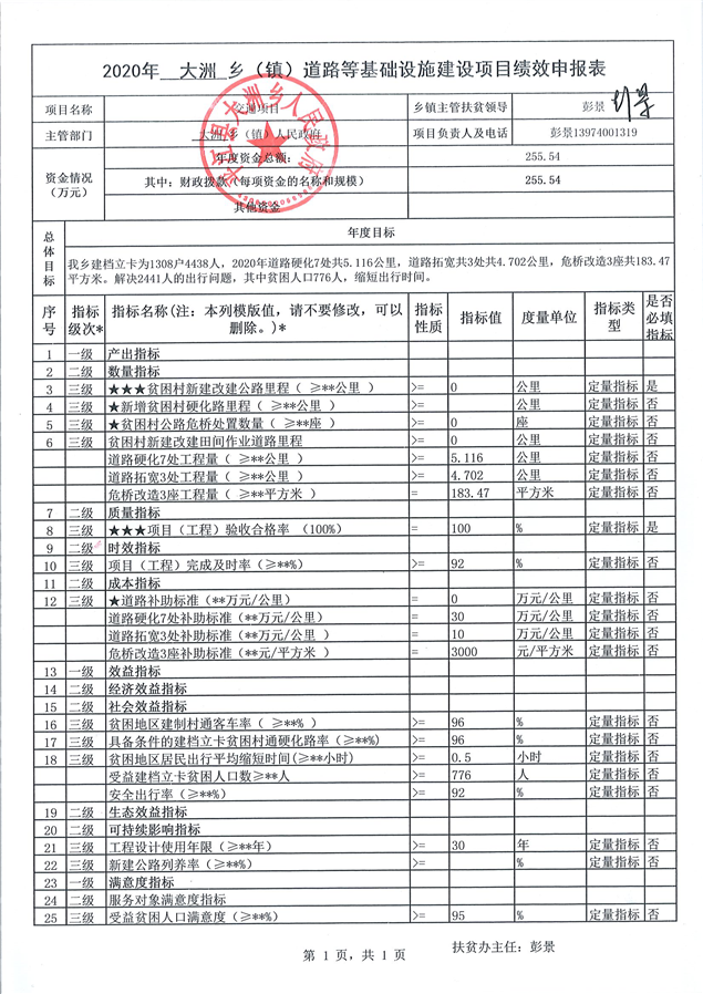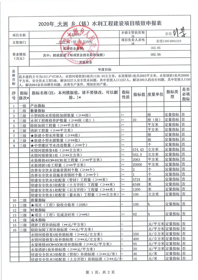 大洲乡2020年统筹整合涉农资金项目库预算绩效申报(调整)